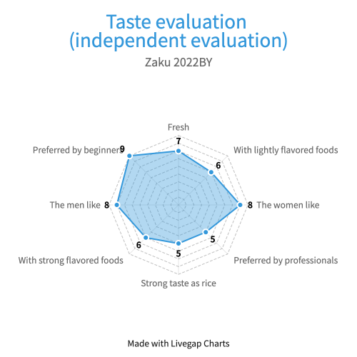 Suitable for aperitifs and mid-meal drinks. Suitable for beginners to intermediate drinkers. For drinkers, a spicier sake may suit their palate better.